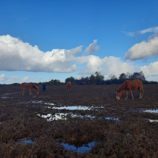 This afternoon, I unintentionally disturbed a buzzard from his "plucking post" as I passed a woodland seasonal pond. Looking at what he had left, he was obviously enjoying a fresh toad! I moved on so he could come back and finish his lunch. The kestrel was out hovering high over the heath, I always look out for him on his territory and he hasn't let me down yet! The deer and ponies were enjoying some sun on their damp, thick coated backs and looking very well for this time of year.